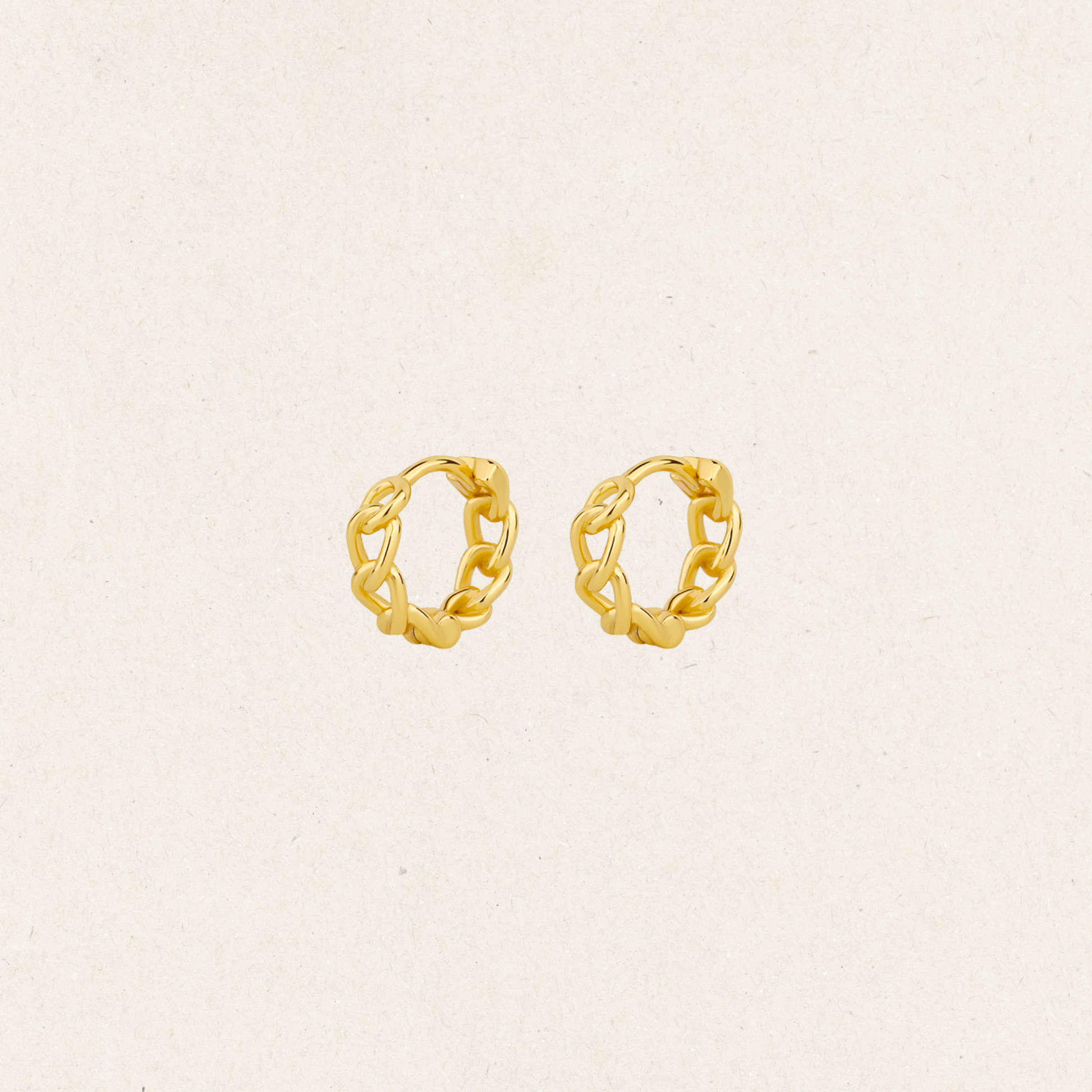 Huggie earrings feature an interlocking chain design with a polished gold finish. The smooth curvature and compact silhouette lend a modern edge to a timeless motif.