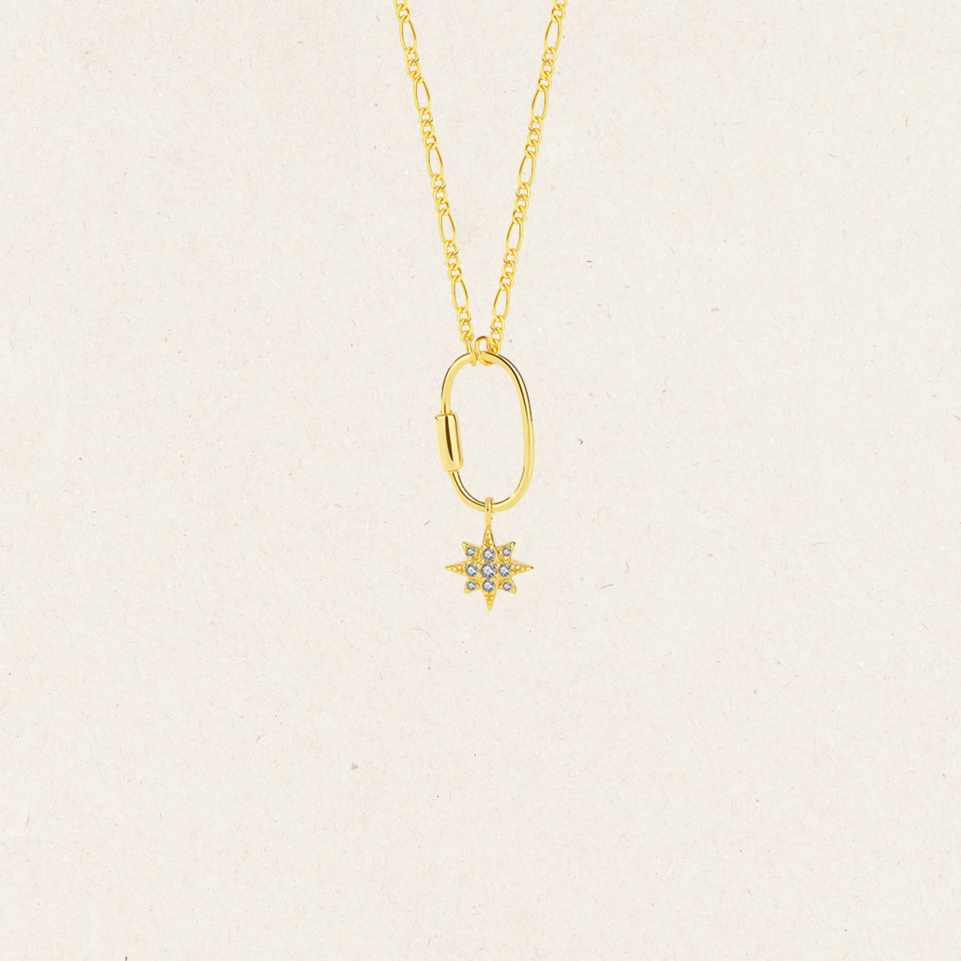 A sparkling starburst charm dangles from a sleek oval link, creating a modern contrast with the fine-textured chain. The crisp lines and radiant stones bring a touch of celestial shimmer to everyday styling.