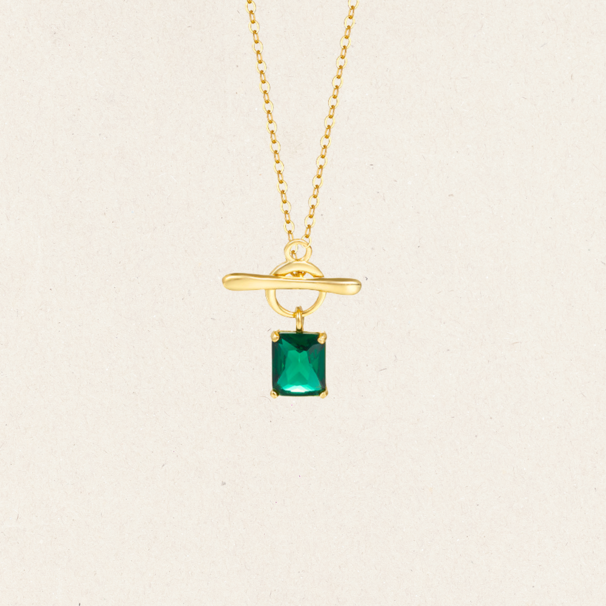 A striking green zircon takes centre stage in this pendant necklace, cut in a refined emerald shape and suspended from a sleek gold toggle clasp. The clean lines and vibrant colour bring a modern edge to this elegant design.