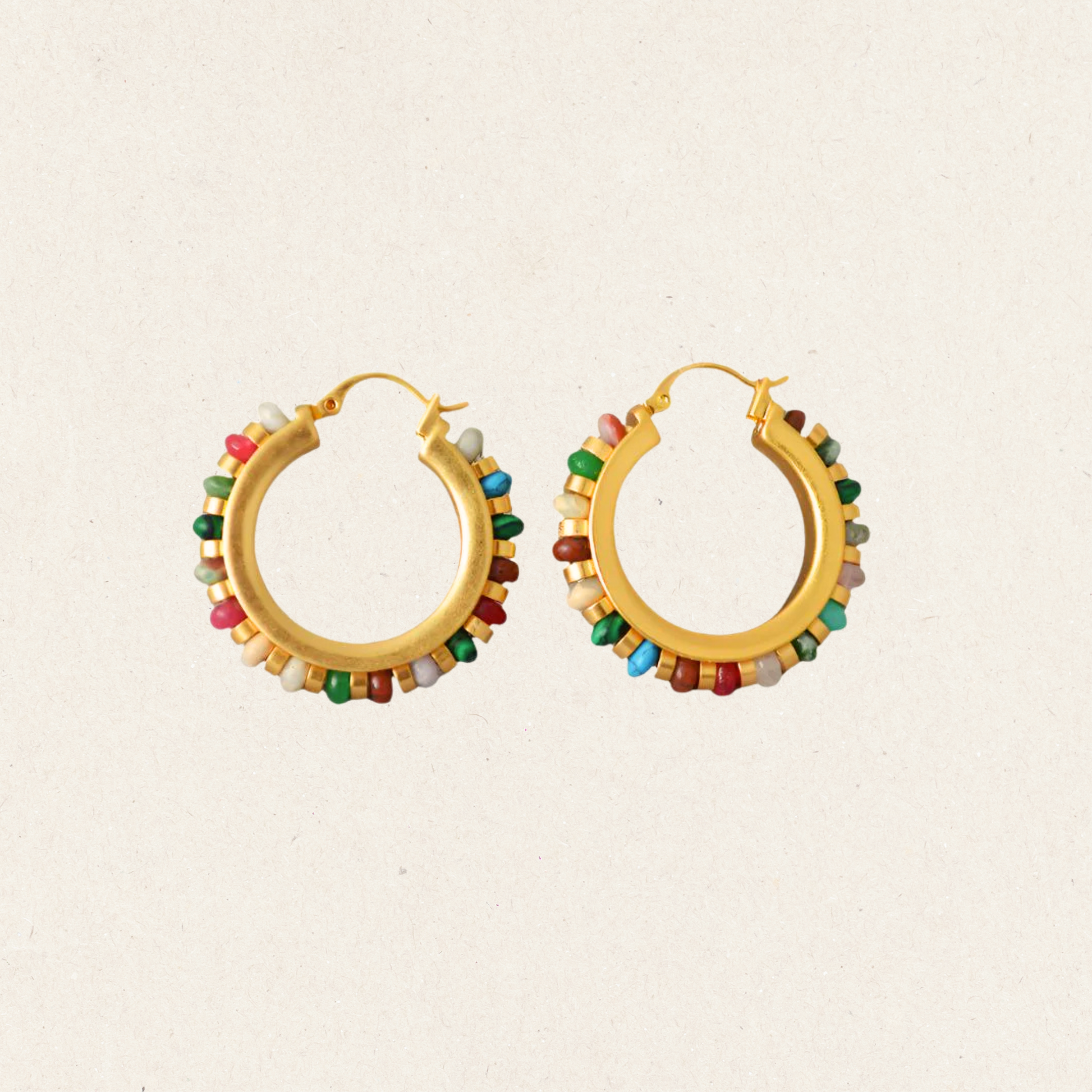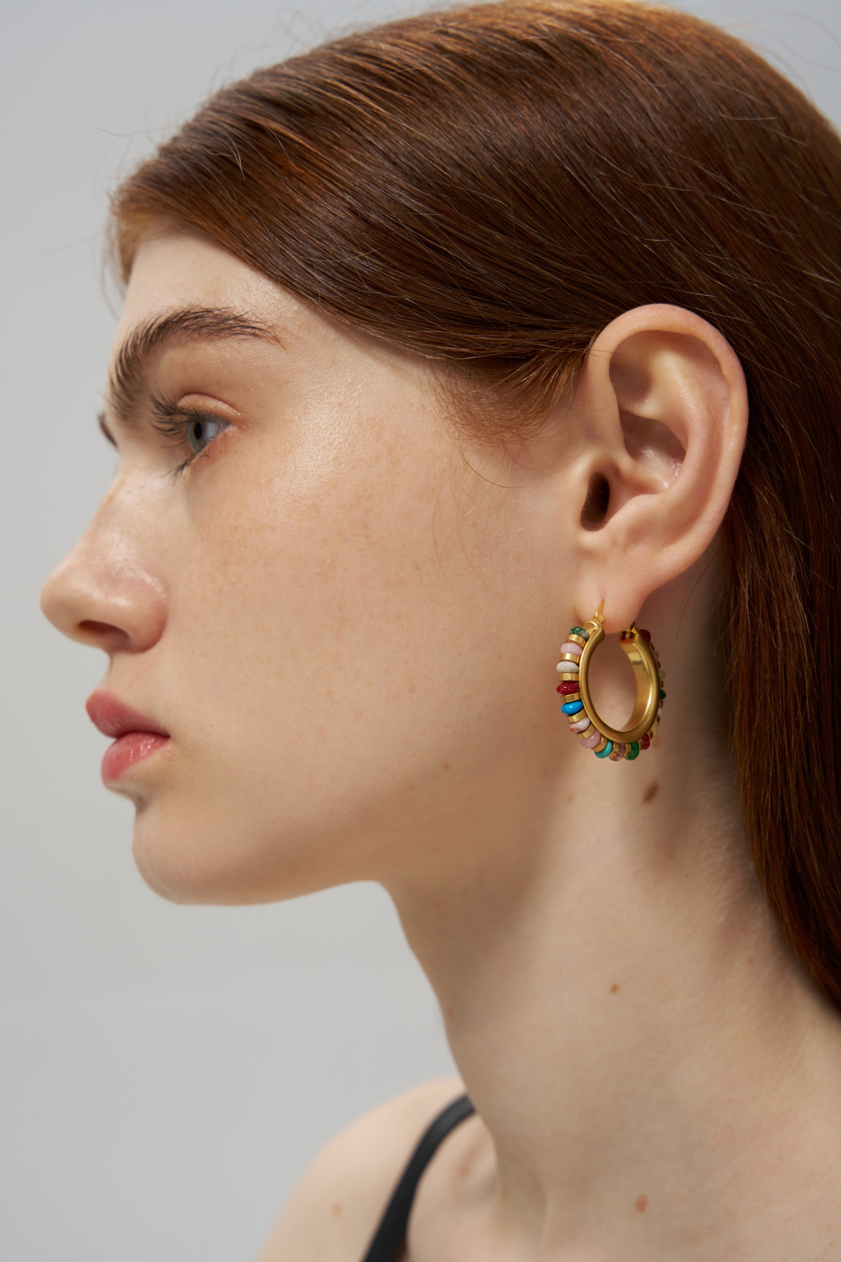 Beaded Rainbow Gemstone Medium Hoop Earrings