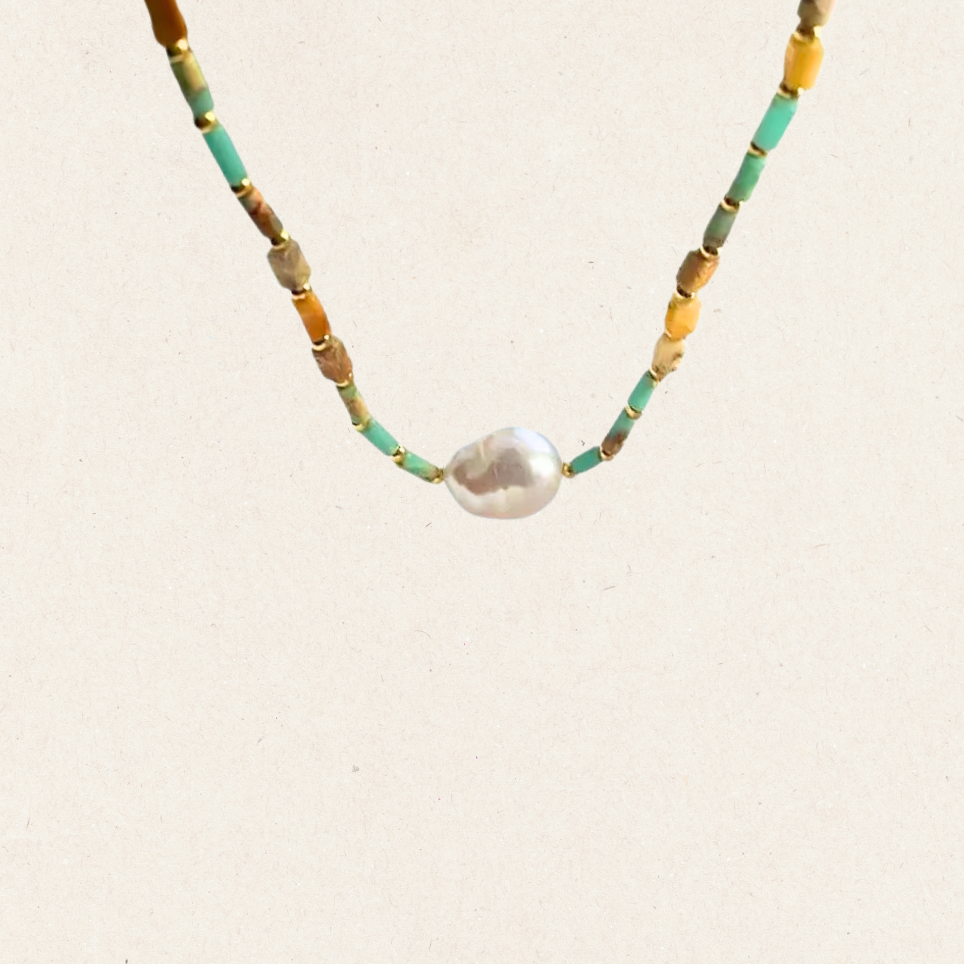 A natural baroque pearl takes center stage in this hand-strung necklace, framed by turquoise, amber, and neutral-toned seed beads. Lightweight and full of coastal charm, Coastal Pearl brings an effortless warmth and artisanal elegance to any look.