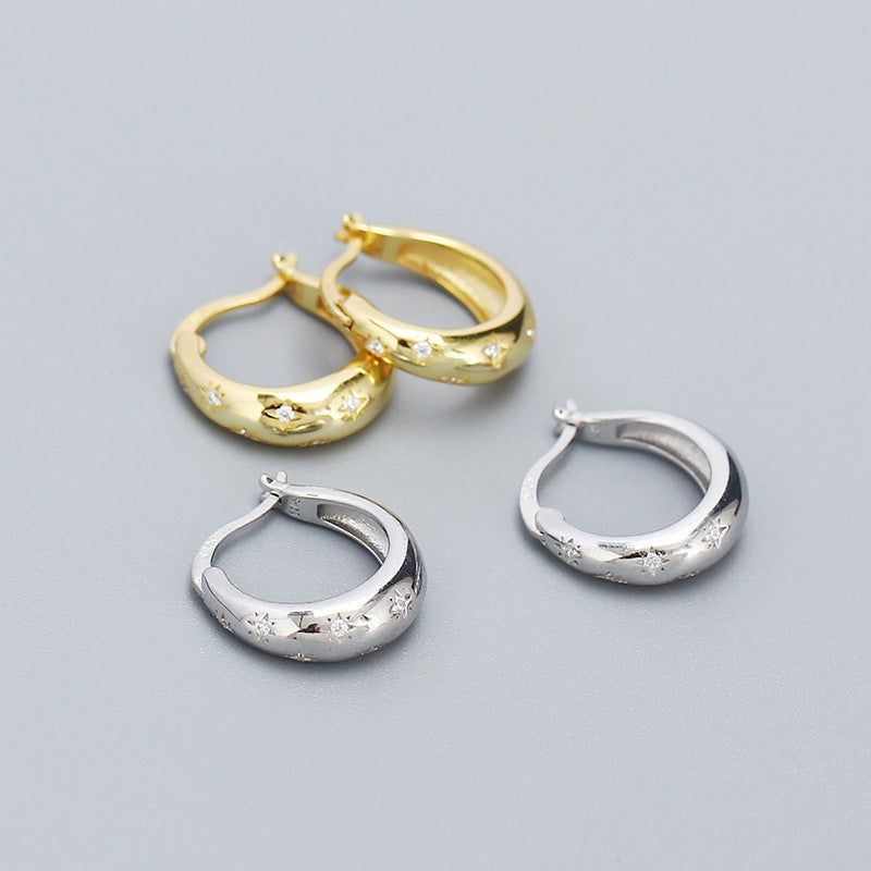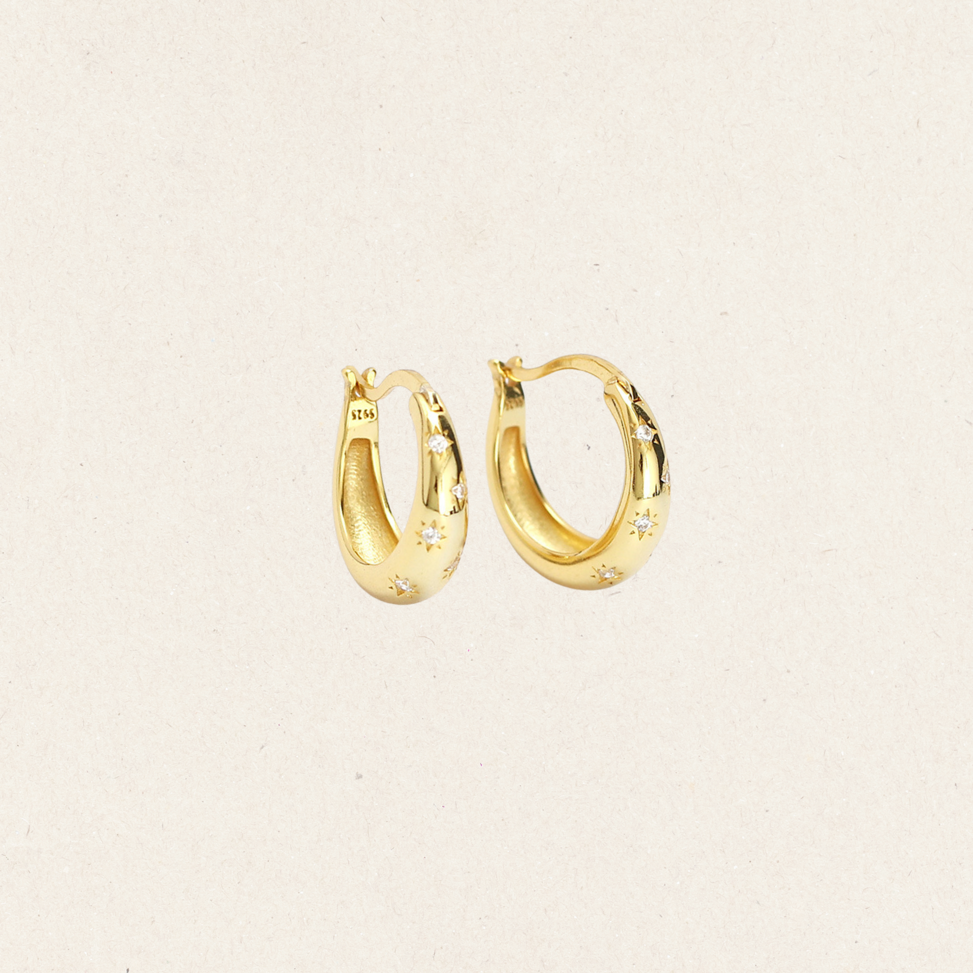 These polished gold hoop earrings are adorned with delicate starburst engravings, each set with a small white crystal for subtle sparkle. Their curved silhouette and celestial details add a touch of modern elegance