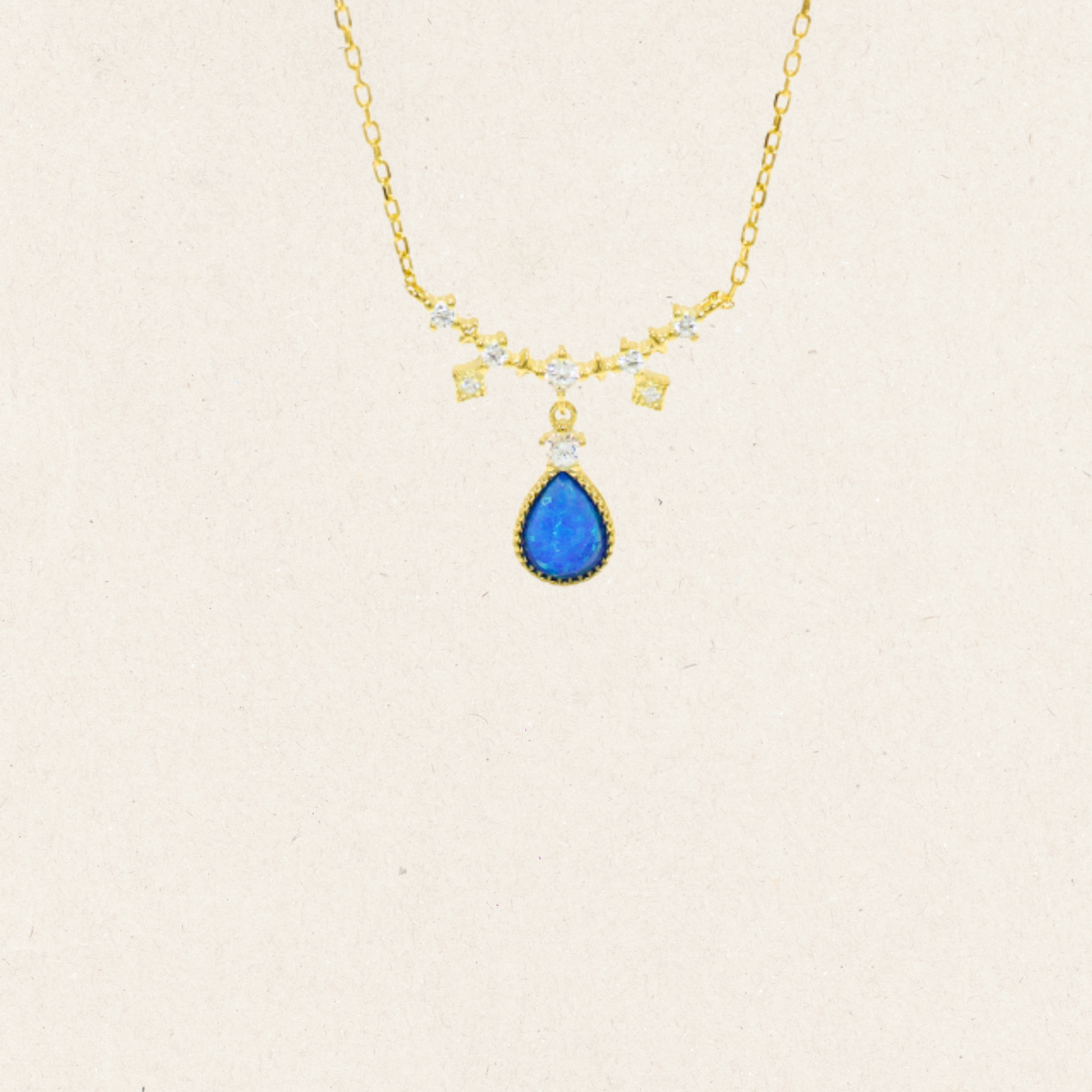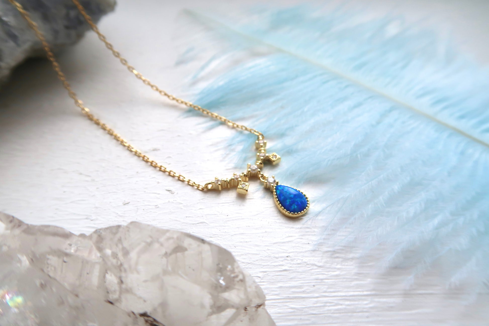 This celestial-inspired necklace features a teardrop-shaped blue opal pendant suspended beneath a cascade of sparkling white stones and golden accents.