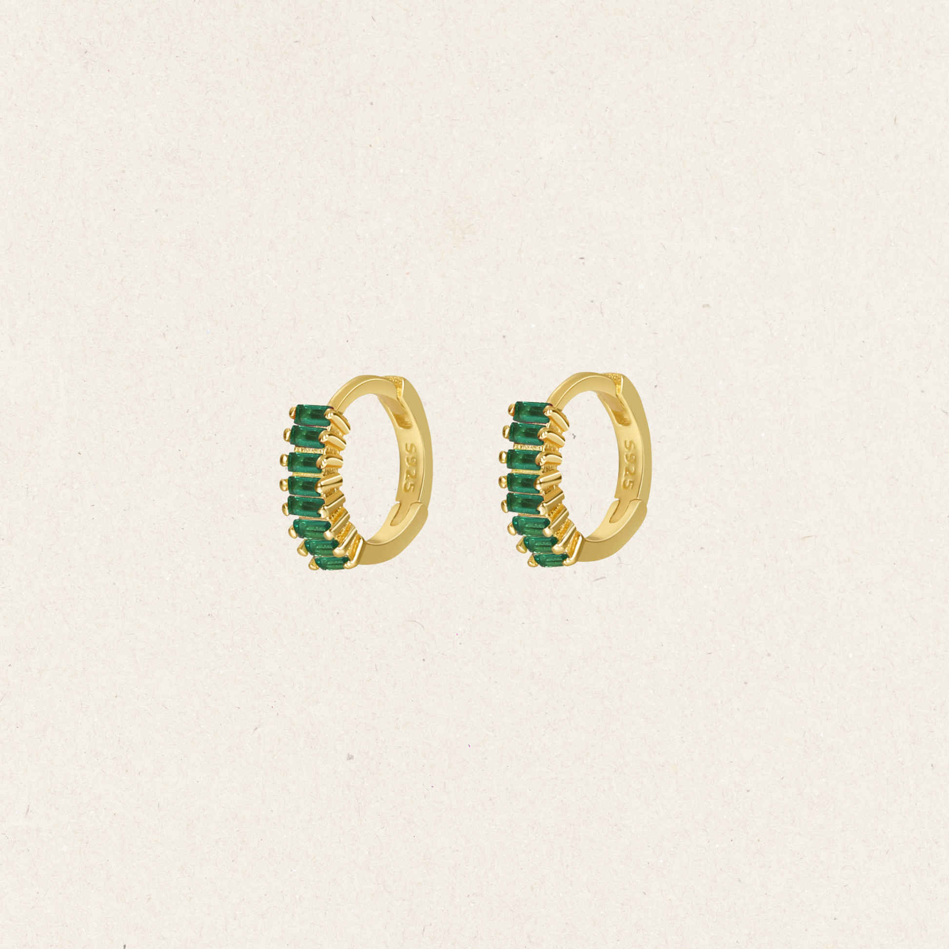 Tiny huggie earrings feature a row of rectangular colorful diamonds, offering a subtle yet vibrant pop of color.Perfect accessory to add a touch of sparkle.