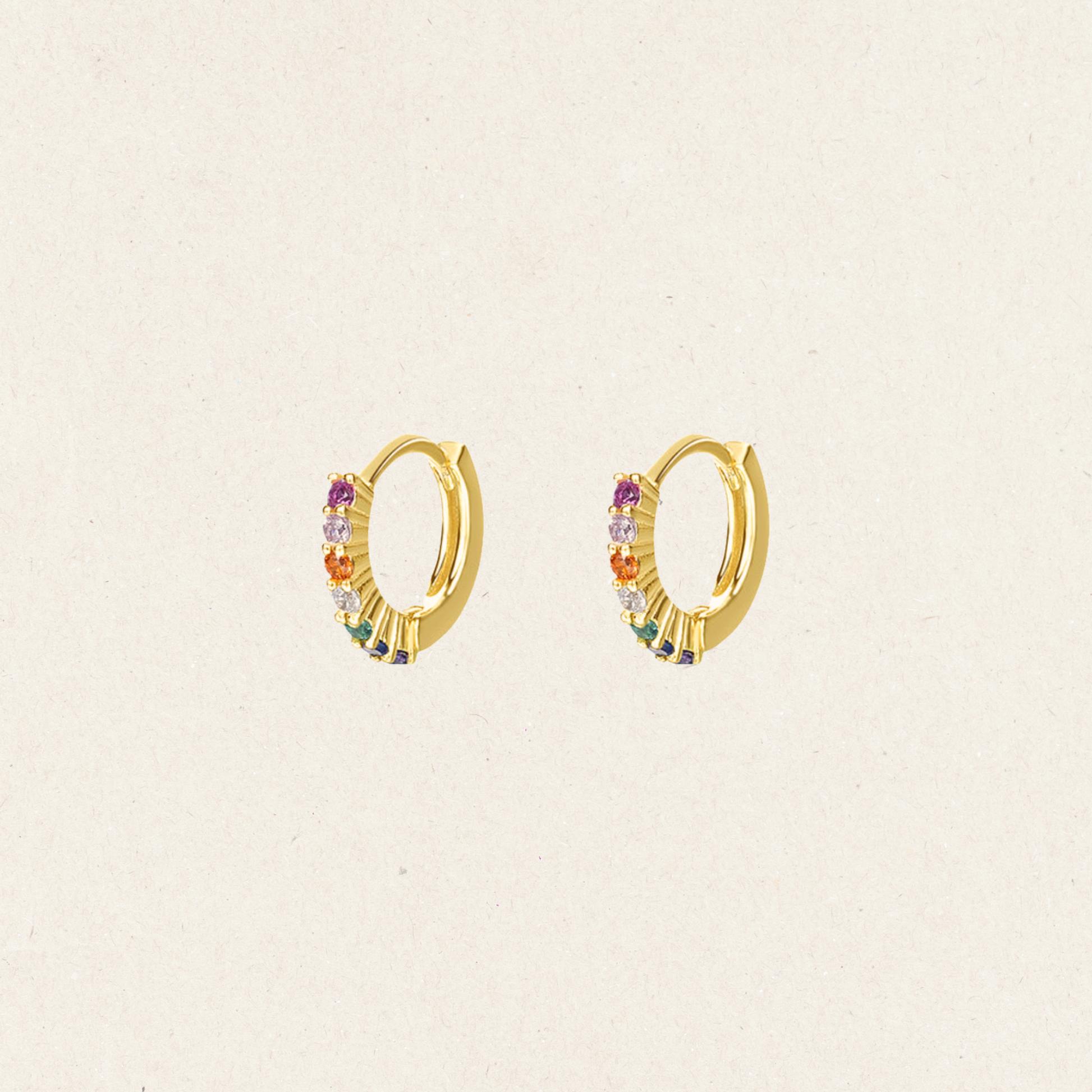Tiny huggie earrings are adorned with vibrant, colorful micro-sized diamonds, adding a playful yet refined touch to your look.