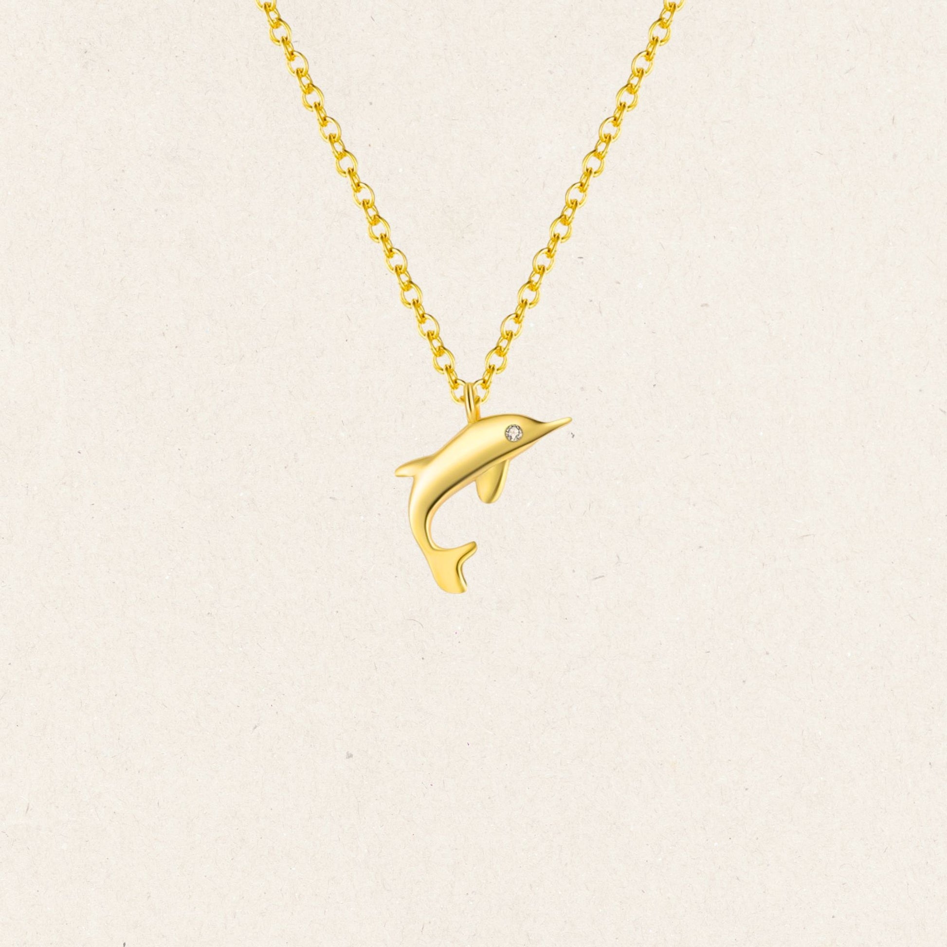 Playful and elegant, this gold-finished necklace features a sleek dolphin charm accented with a single sparkling stone as its eye. Symbolizing joy, freedom, and protection, it's a meaningful piece that adds a touch of ocean-inspired charm to any look.