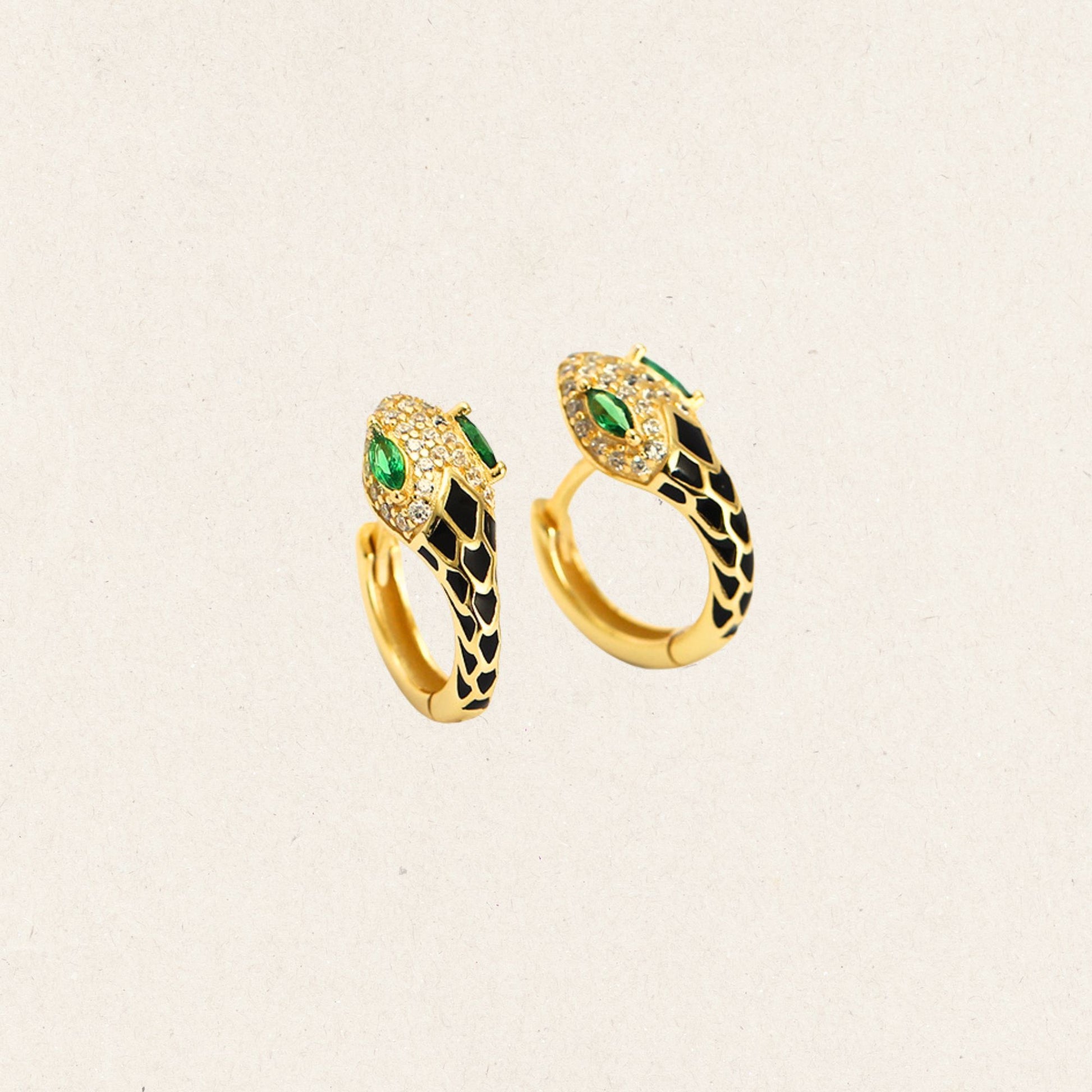 Shaped into the sleek curve of a serpent, these golden hoops gleam with bold elegance. Green zircon eyes and enamel-scaled details bring a sense of power, charm, and ancient mystique.