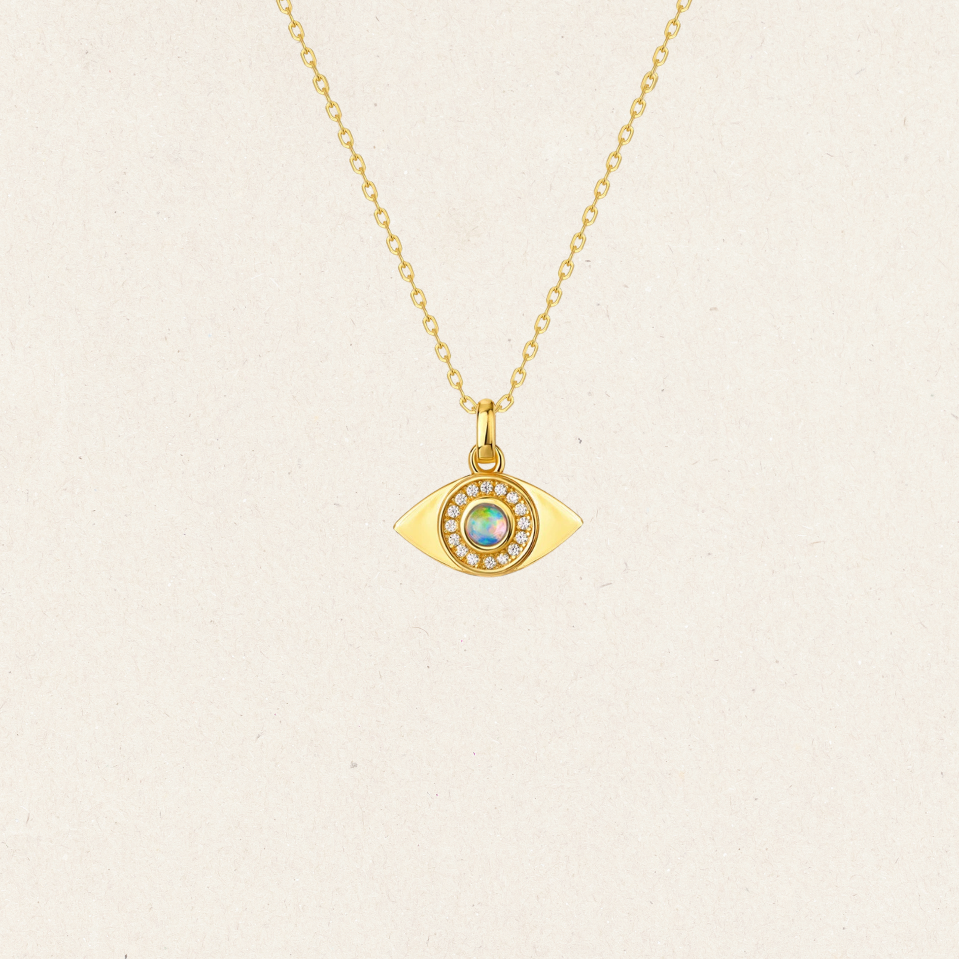 Golden eye pendant centers a radiant opal — a stone long associated with insight, protection, and emotional clarity. Surrounded by a delicate halo of shimmering stones, it symbolizes an inner knowing that sees beyond appearances.