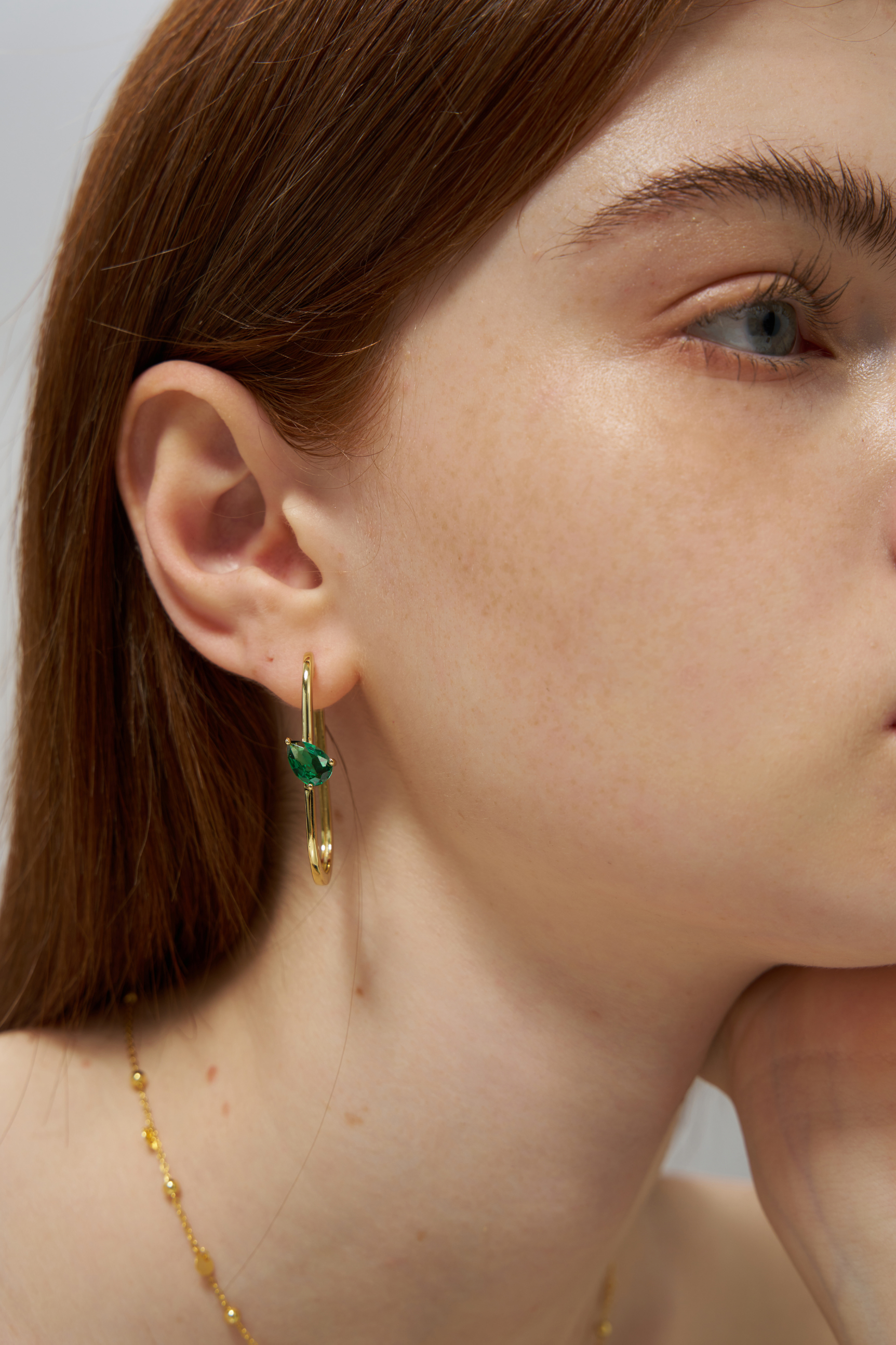 This striking pair of hoop earrings features asymmetrical design elements—one with a sleek baguette-cut green topaz accented by a row of pavé-set white stones, the other with a pear-cut green topaz set vertically. The contemporary silhouette and vibrant green hues create a bold.