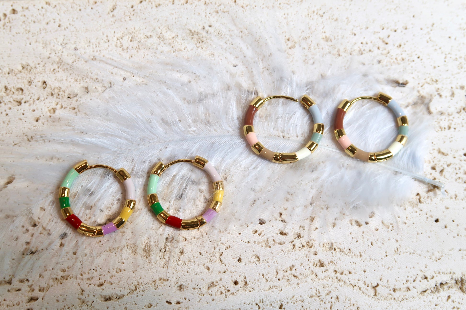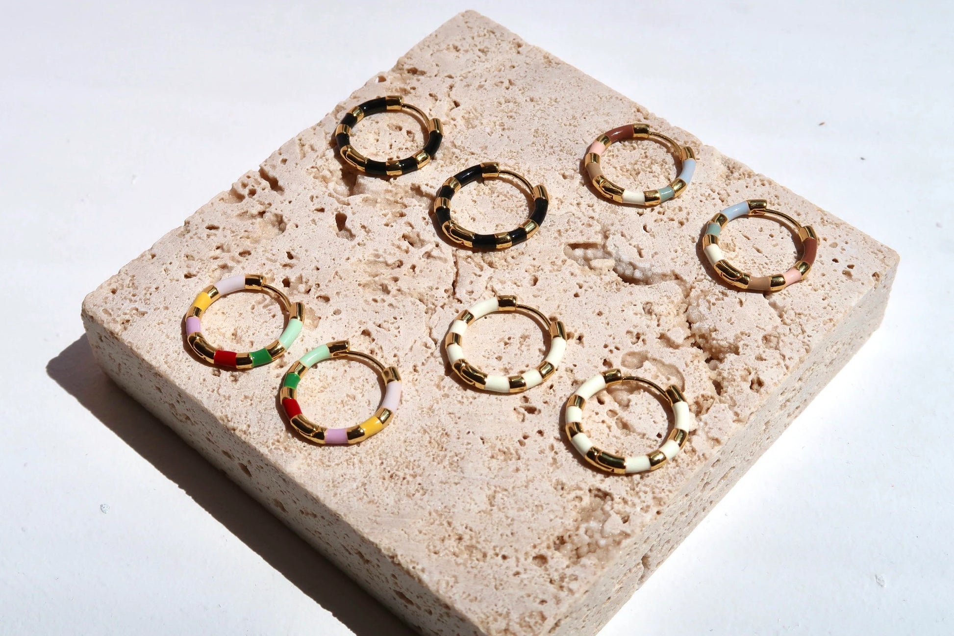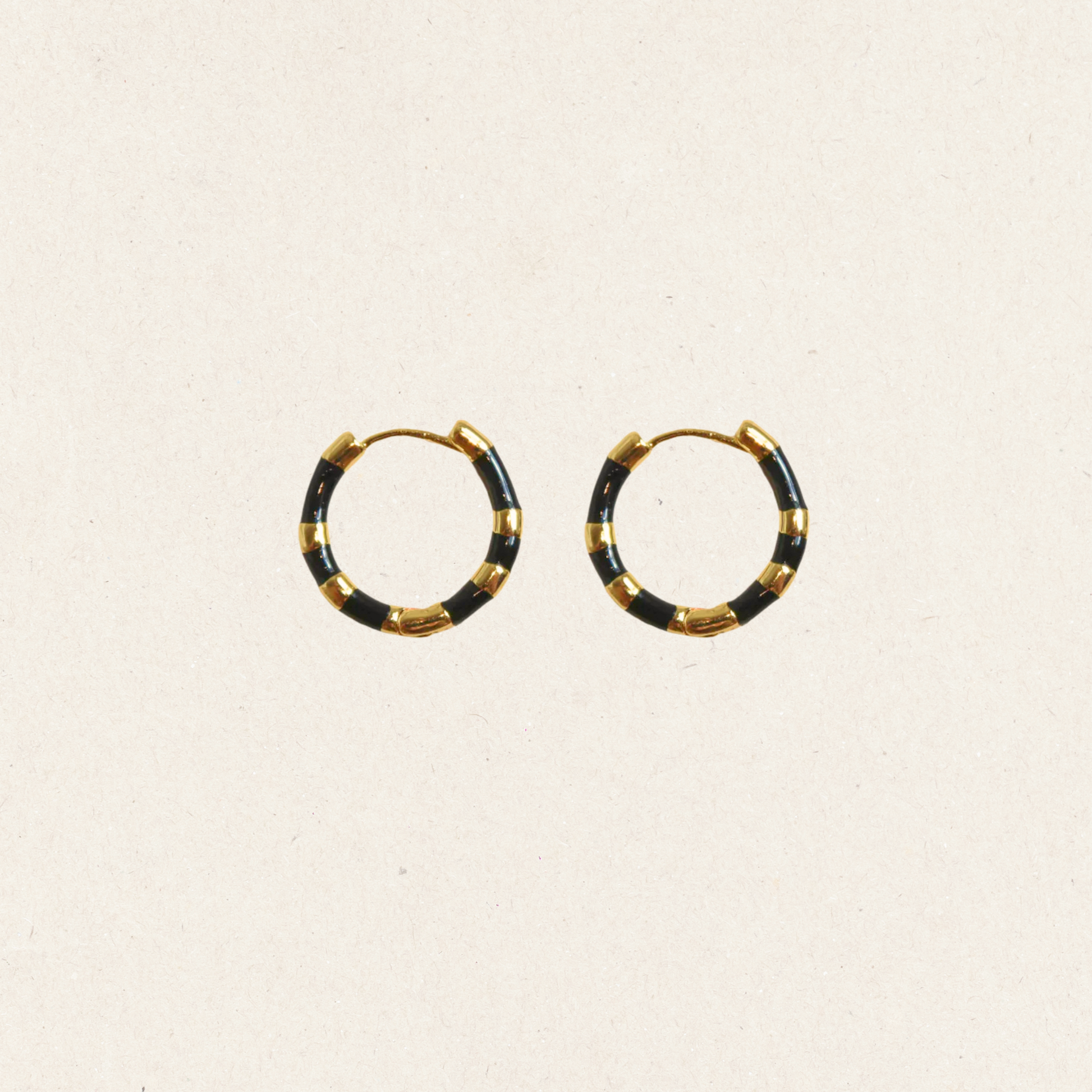 These small hoop earrings feature alternating bands of glossy black enamel and polished gold-tone accents, creating a bold yet wearable striped design. Their compact size and seamless clasp make them perfect for everyday wear with a refined finish.