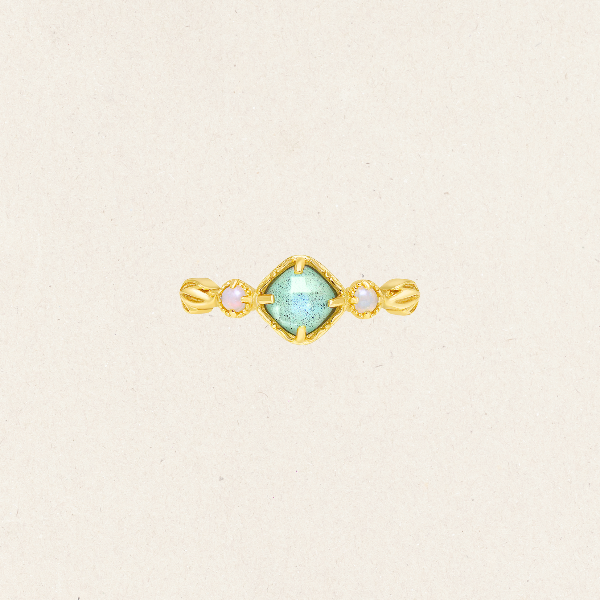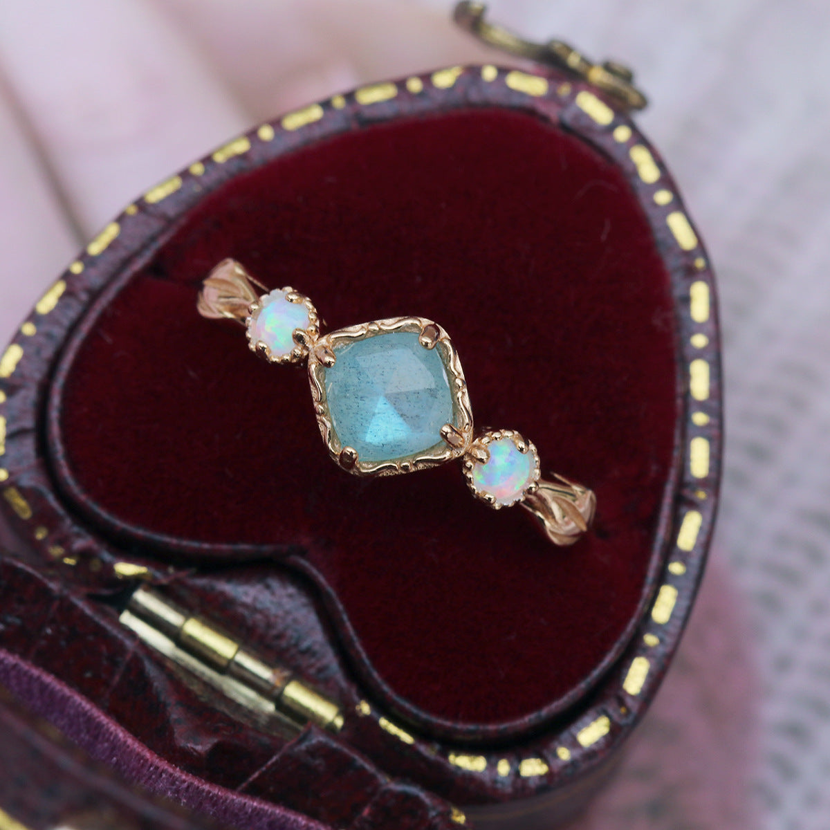 This ring features a cushion-cut amazonite at the centre, flanked by two round opals on each side. The gold band is accented with sculpted leaf-like details, adding a natural touch to the overall design.