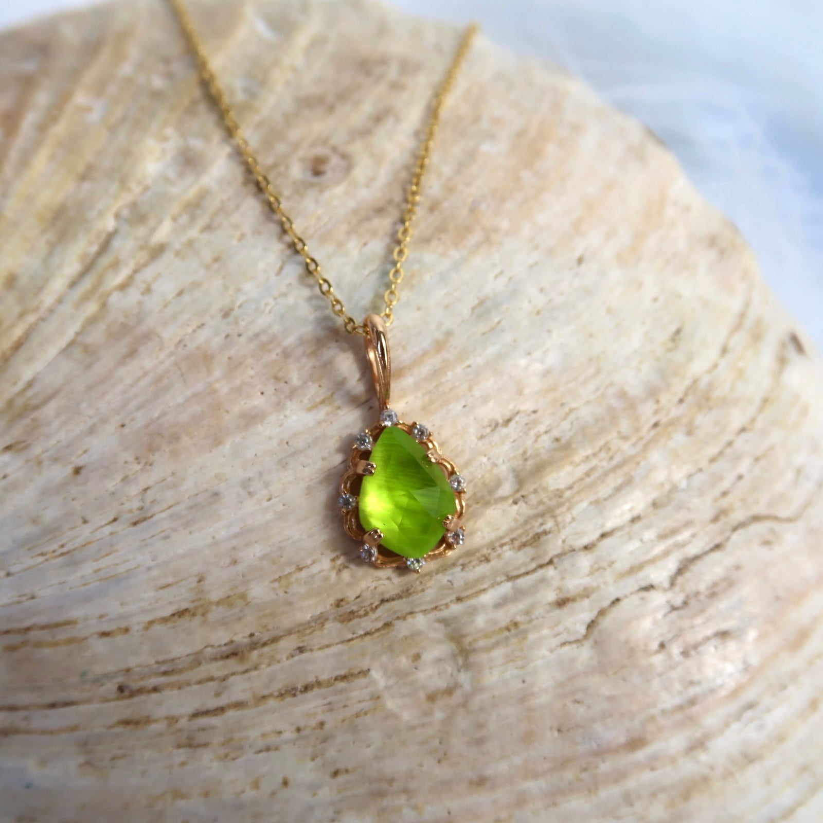 This necklace features a vibrant lime green teardrop pendant crafted from peridot, delicately framed with sparkling crystal accents. Set against a base of white mother-of-pearl, the pendant shimmers with layered iridescence — a luminous interplay of both gemstone and shell. Known as the stone of positivity and renewal, peridot is believed to bring warmth, clarity, and emotional balance