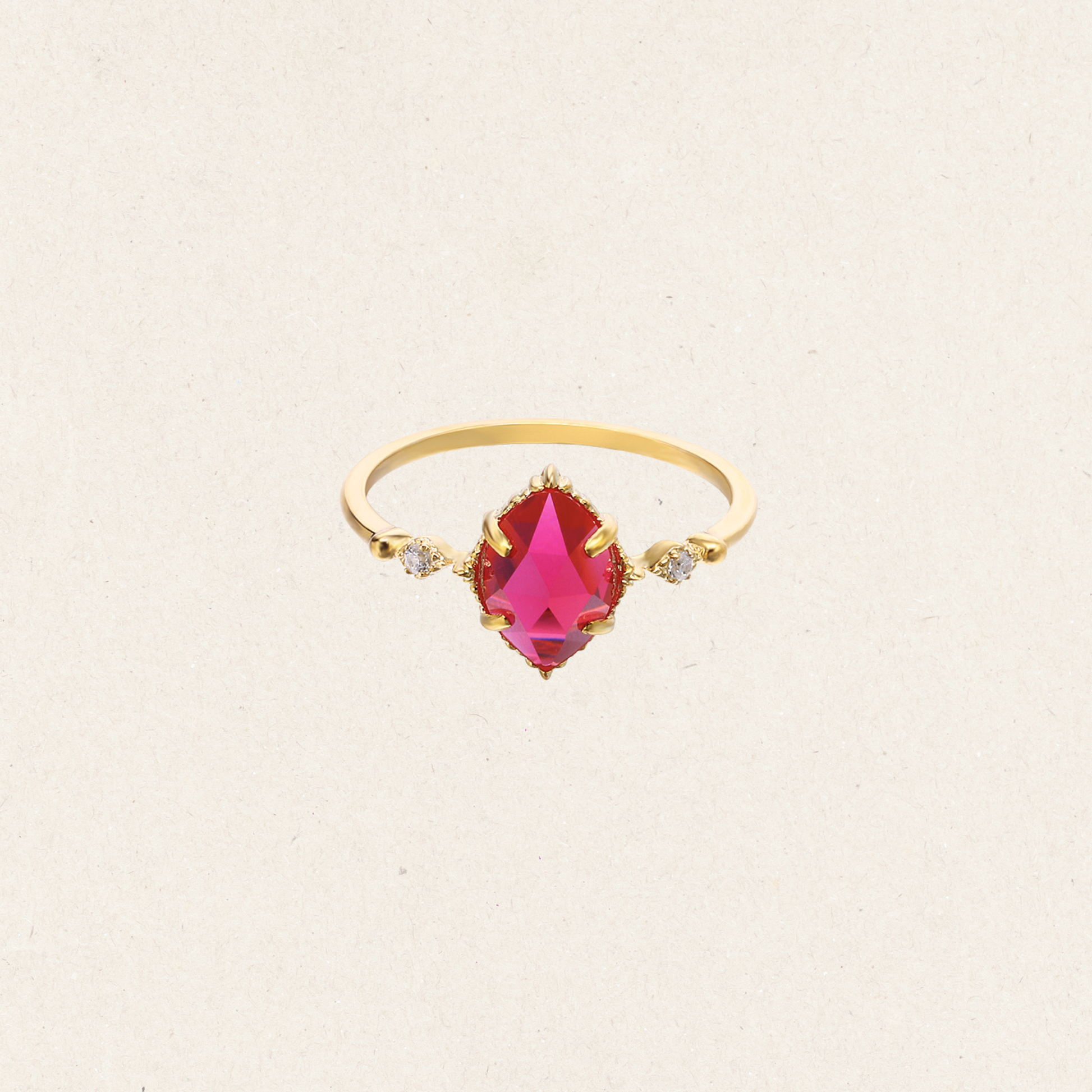 This ring showcases a pear-shaped red spinel set in a gold claw setting, accented with two small white stones on each side. The slender band emphasises the rich colour of the centre stone.
