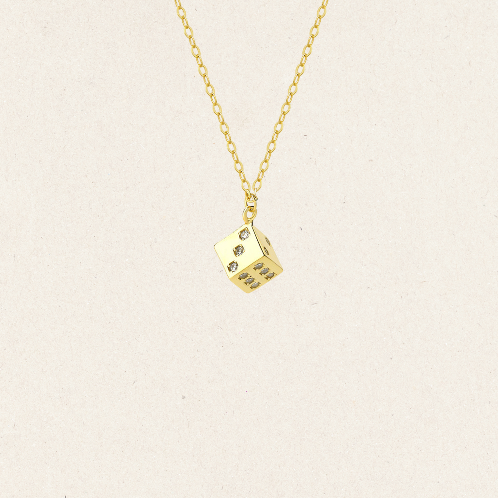 Crafted in radiant gold tone, this playful pendant features a 3D dice charm adorned with sparkling stones. Symbolizing chance, luck, and bold spirit, the design brings a fun twist to everyday style. Perfect for layering or wearing solo, it’s a statement of confidence and individuality.