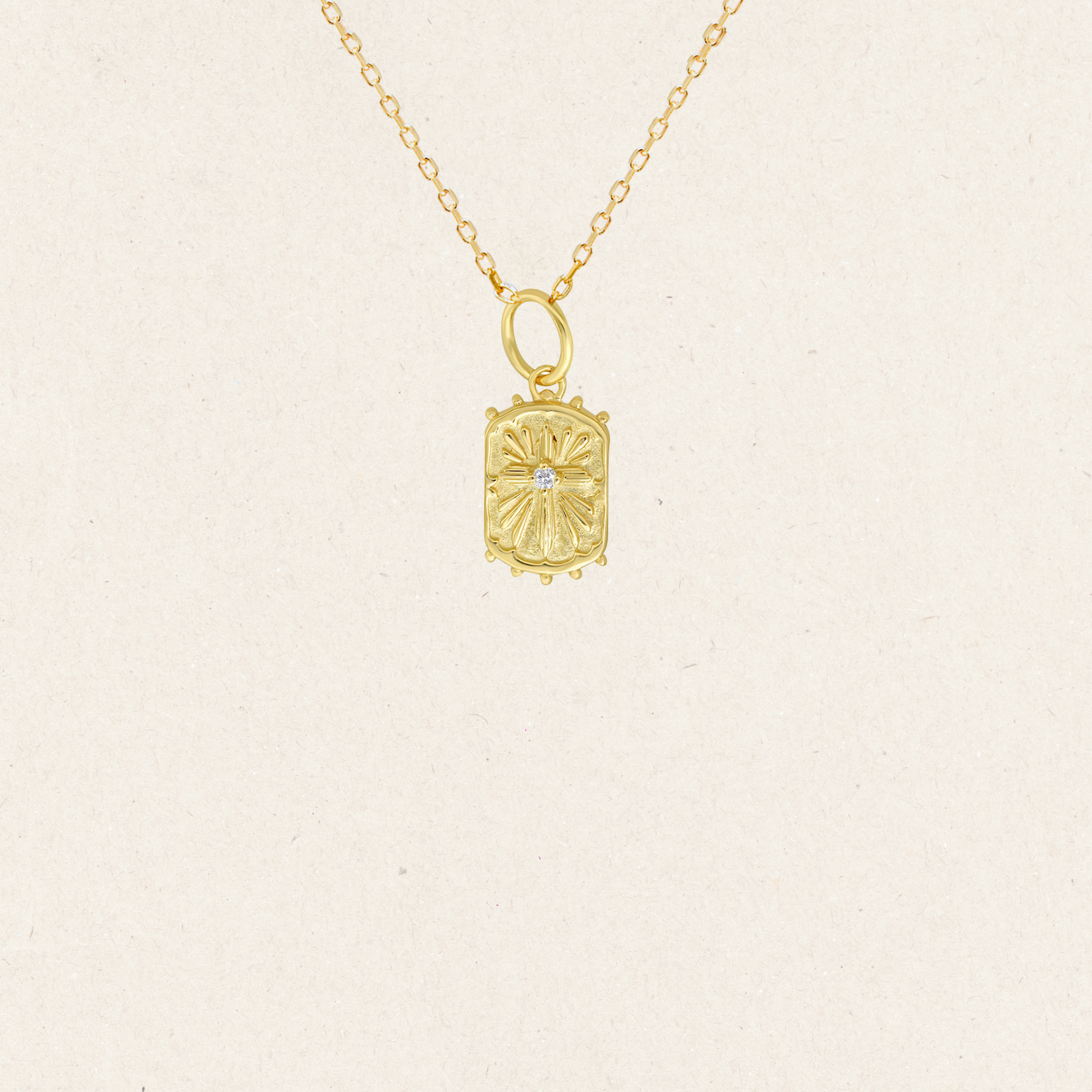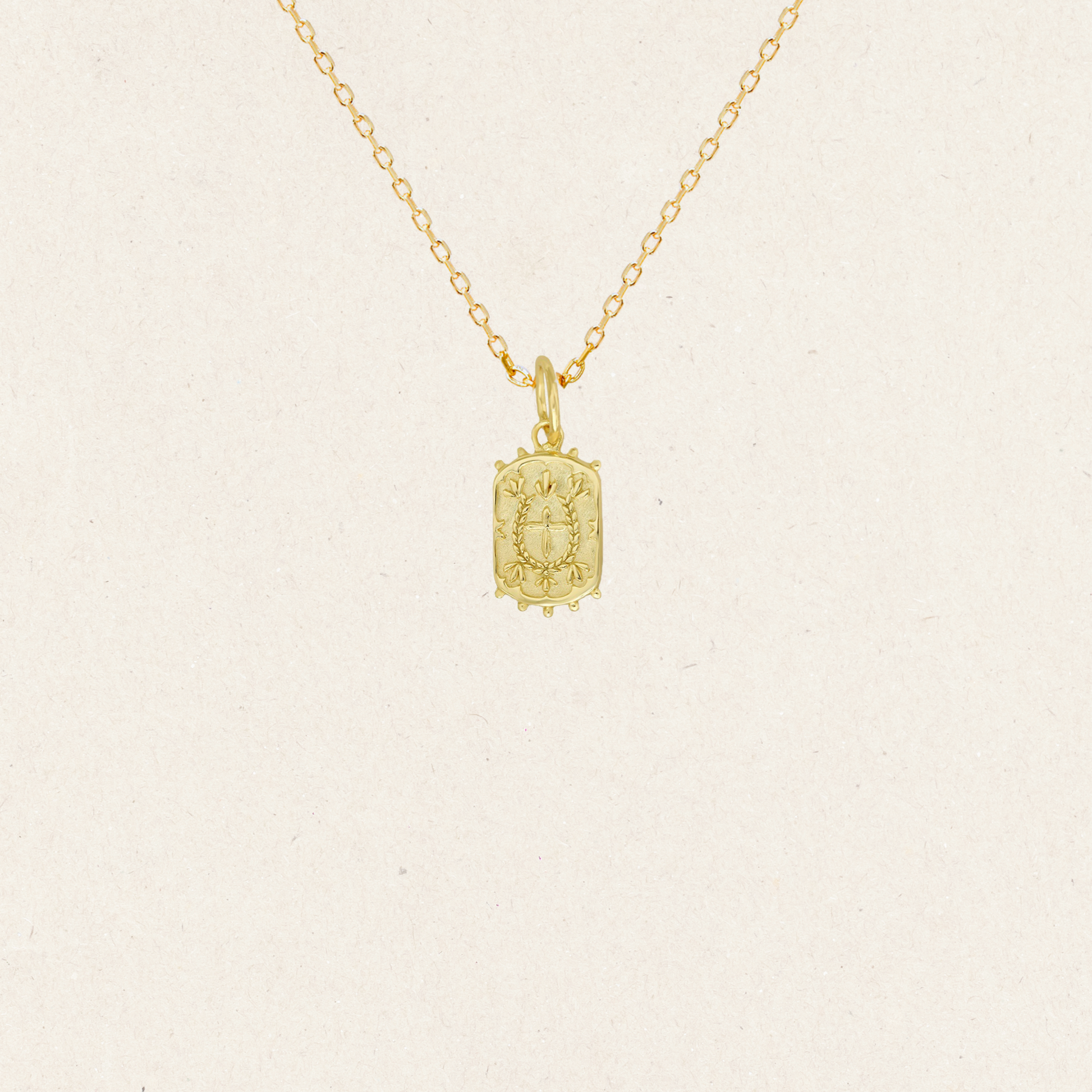 This gold medallion necklace features an engraved crest design framed with fine dotted edges. At its center, a sword encircled by laurel leaves symbolizes courage, strength, and honor.Subtle statement of inner strength and resilience, perfect for everyday wear or as a meaningful gift.