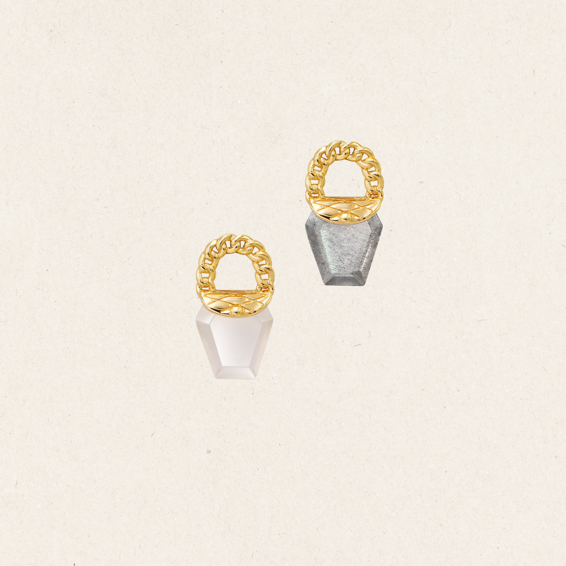 This hexagon-cut gemstone pendant features your choice of luminous labradorite or glowing moonstone, each set with a detailed vintage-style gold loop. The faceted surface catches light beautifully, while the stone's natural character brings depth and mystery.