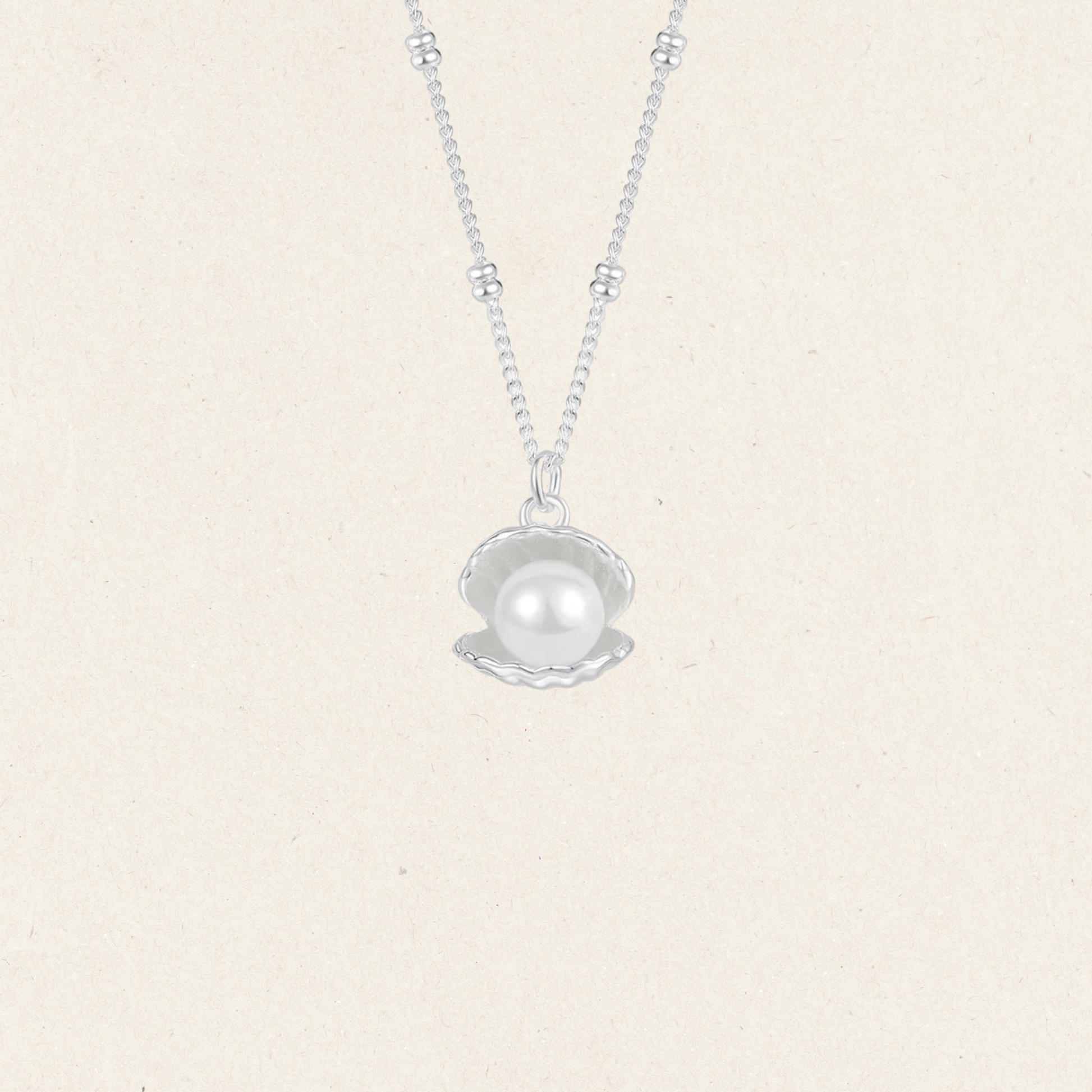 This necklace features a small seashell with a pearl at the centre of the pendant, complemented with a silver chain.