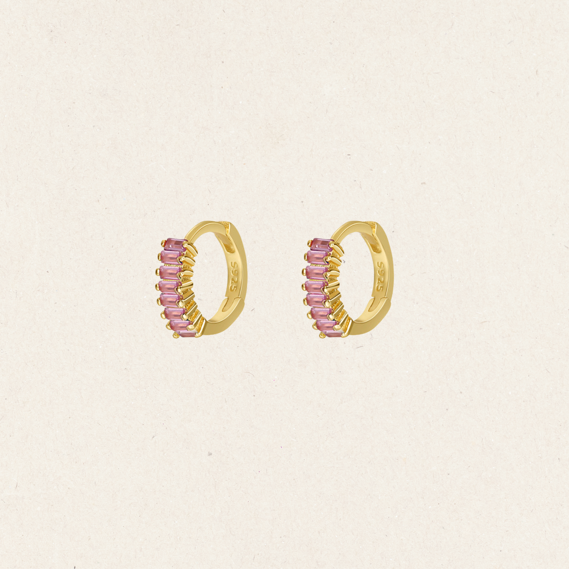 Tiny huggie earrings feature a row of rectangular colorful diamonds, offering a subtle yet vibrant pop of color.Perfect accessory to add a touch of sparkle.