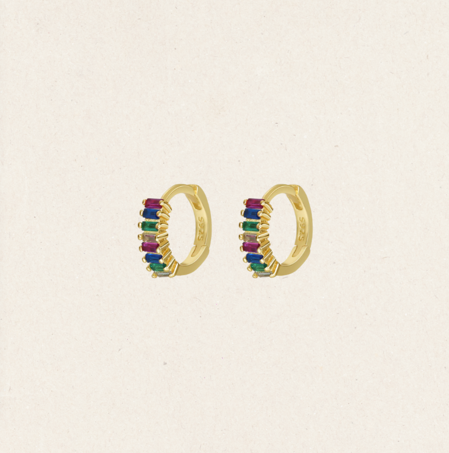 Tiny huggie earrings feature a row of rectangular colorful diamonds, offering a subtle yet vibrant pop of color.Perfect accessory to add a touch of sparkle.