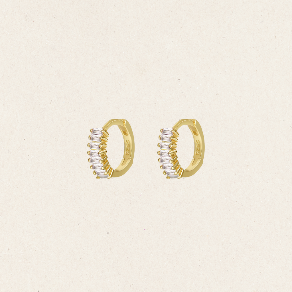 Tiny huggie earrings feature a row of rectangular colorful diamonds, offering a subtle yet vibrant pop of color.Perfect accessory to add a touch of sparkle.