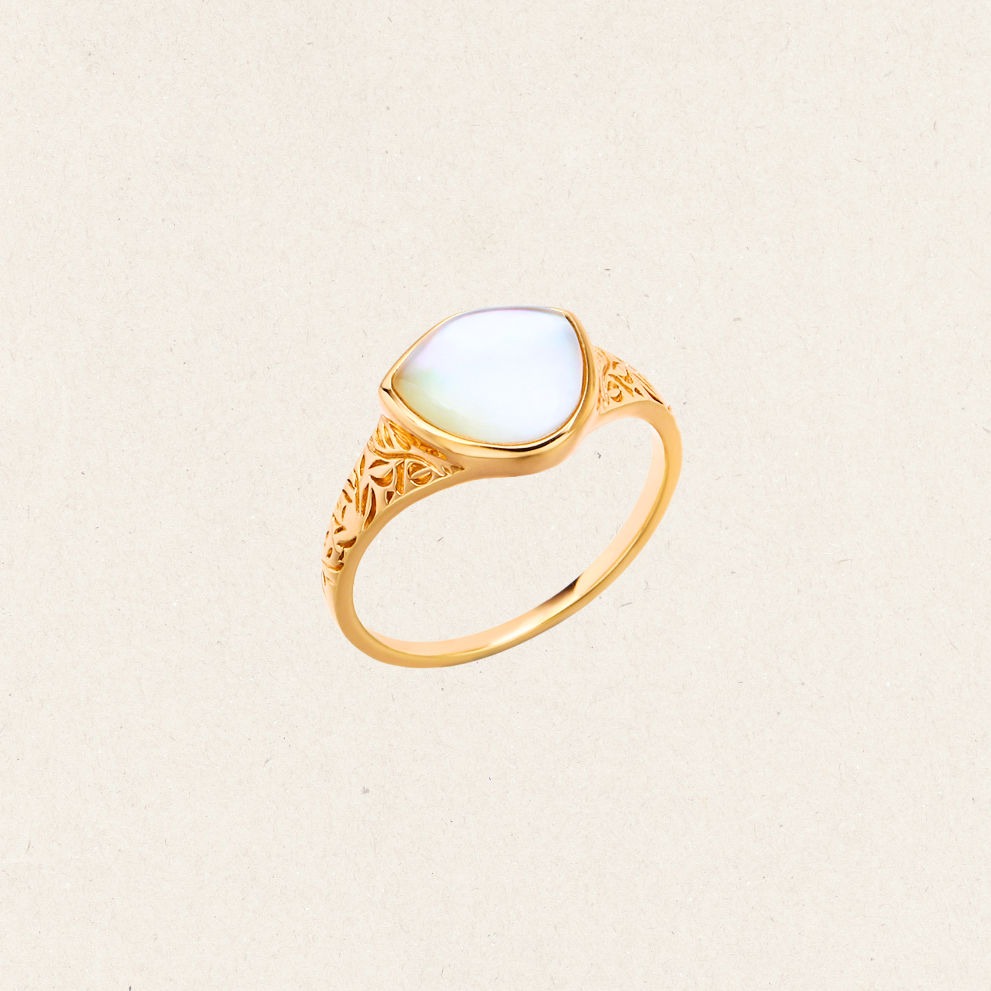 This ring features a luminous moonstone set in a delicately carved gold band. The soft, shifting glow of the stone captures light like a drop of moonlight, while the intricate details on the band add a vintage-inspired charm.