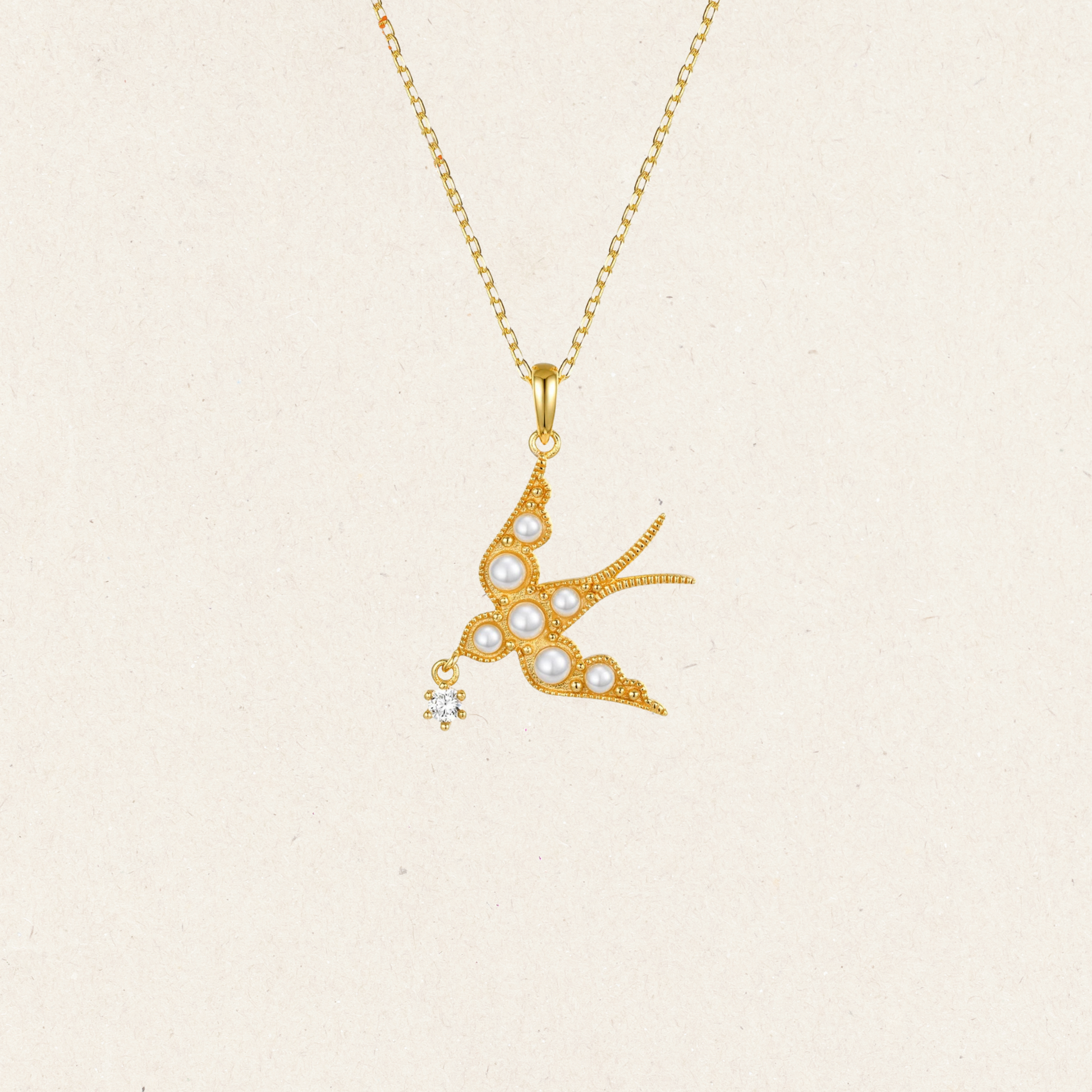 Graceful and light, this swallow pendant necklace features lustrous pearls and a sparkling accent stone, symbolizing freedom, new beginnings, and peace.
