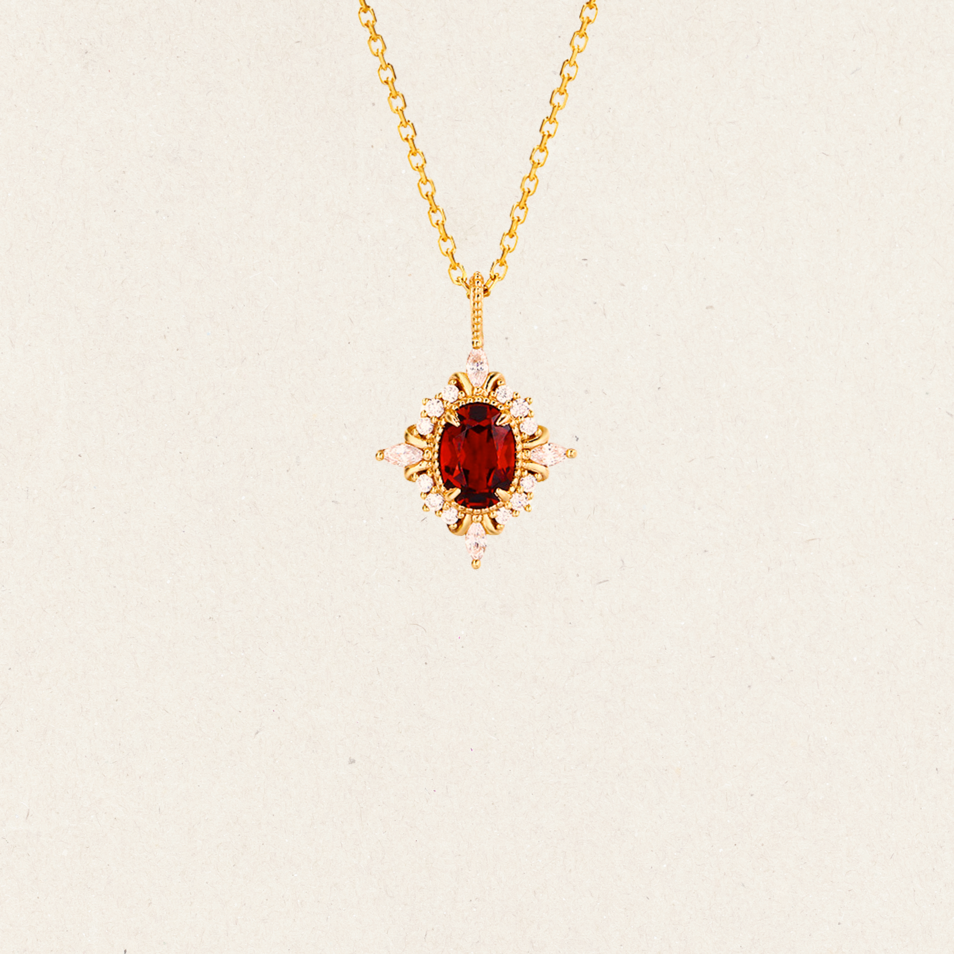 This necklace showcases an oval-cut ruby set in a vintage-style gold frame, accented with sparkling white stones. The detailed setting and balanced design give it a refined.